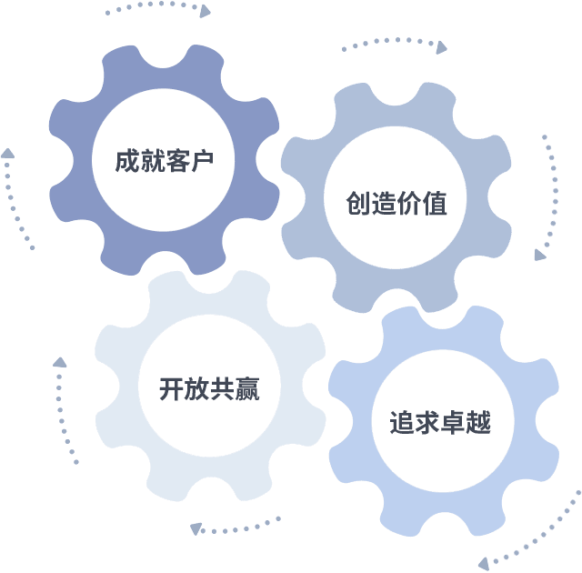 成就客户是一切决策的出发点,,,,创造价值是衡量所有工作的标准,,,追求卓越是我们做事做人的态度,,,,开放共赢是我们的格局也是最终的结果。。。。价值观的齿轮环环相扣,,,,推动着组织里的每个人不断向前。。。